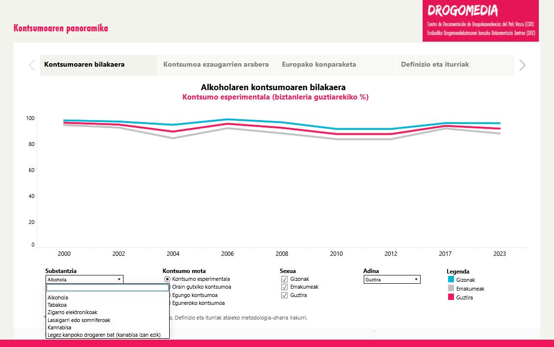 Drogomediak edukiak zabaltzen jarraitzen du tabakoari, alkoholari eta cannabisari eskainitako bisualizazio berriekin. Horrela, “Kontsumoaren Panoramika” datu-bankuari material berriak gehitzen zaizkio, kontsulta eta datuen azterketa errazteko pentsatutako formatu batean.